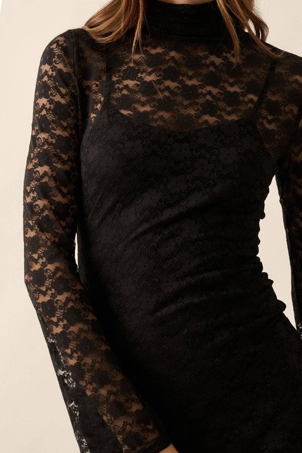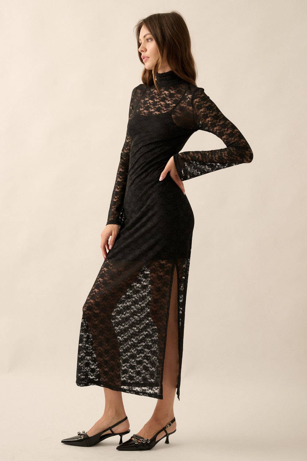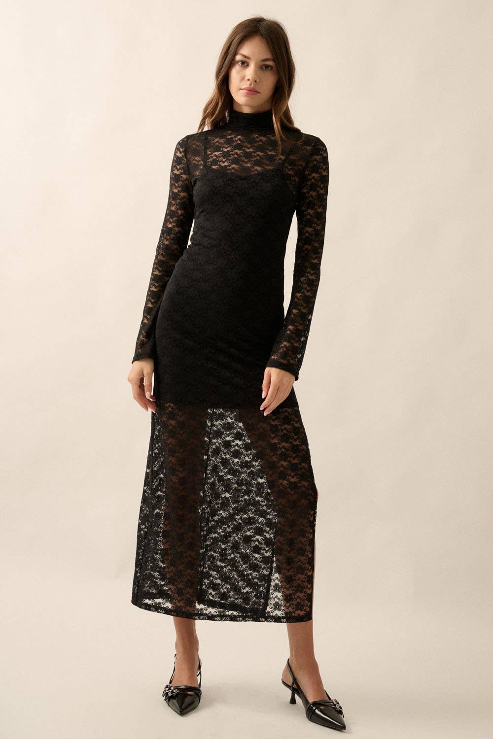 A floral-lace mesh midi dress with the following features: High neckline. Long sleeves. Invisible back zipper and button closure. Center back seam. Side slit. Thigh length lining. Calf length. Fitted silhouette. Model is wearing a size small!