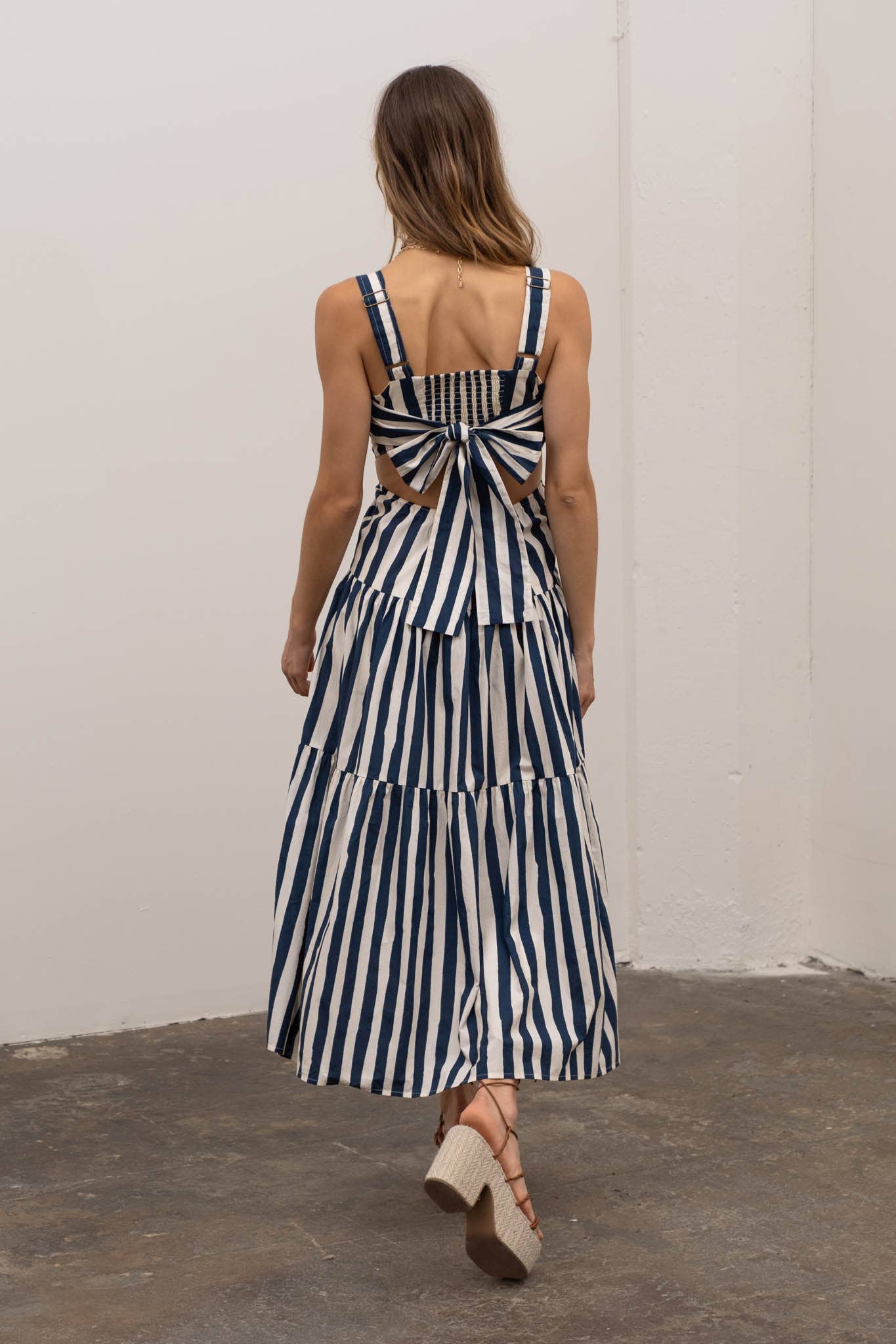 STRIPE PRINT - RUFFLED - BACK TIE CUT-OUT - SHIRRED - TIERED - SMOCK - MIDI DRESS - LINED - SHELL:80%POLYAMIDE, 20%VISCOSE LINING:100%VISCOSE