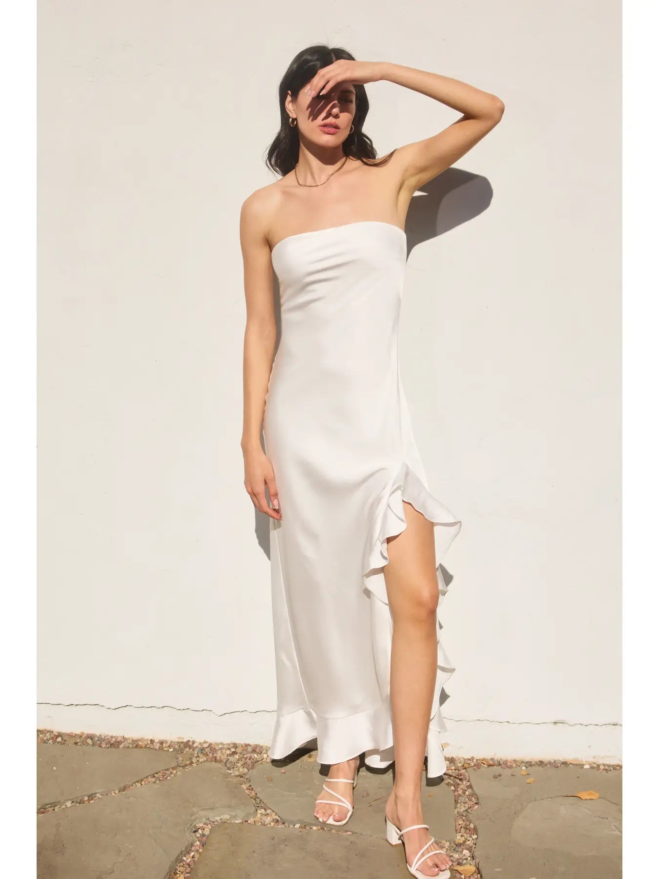 Strapless satin maxi dress featuring a ruffled side slit and hem. Model is wearing a size Small. - Elastic band with gel grip tape on the neckline - Pull on design - Some stretch from the bias cut - Ruffled side slit and hem - Lined Shell: 100% Polyester Lining: 100% Polyester
