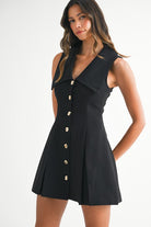 Sleeveless Peter Pan collar v neck gold button mini dress.