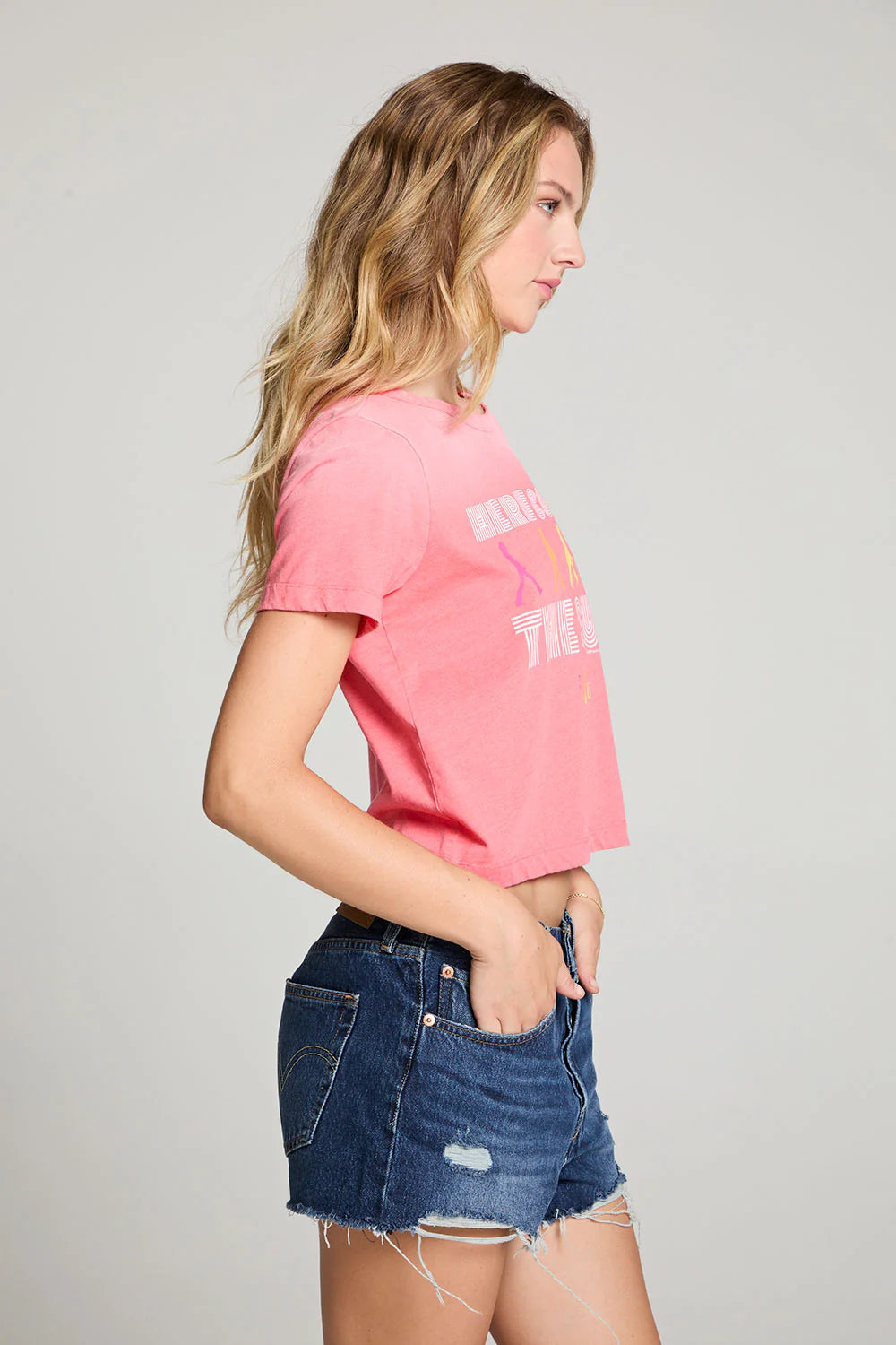 This playful pink tee features a nostalgic design and 60s font, perfect for spreading cheer wherever you go.
