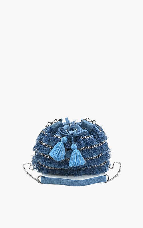 a playful twist on classic denim! Measuring 14 x 8.5 x 6 inches, this bag features eye-catching fringes that bring a boho charm to your look. The long detachable strap makes it easy to carry, while the drawstring fastening ensures your essentials stay secure.