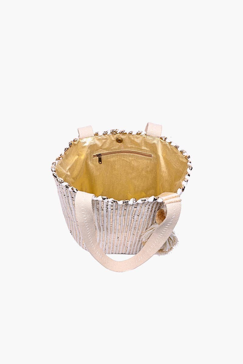 Multi-purpose tote, made by handweaving fabric with lurex, double shoulder straps, pompom tassel charm attached, hanging zip pocket attached inside, magnet button closure. Color: white. One size. 70% cotton, 20% lurix, 10% jute. Do not wash.