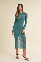 Long sleeve mesh with rhinestone detail bodycon maxi dress in color Teal with lining. Back slit detail.