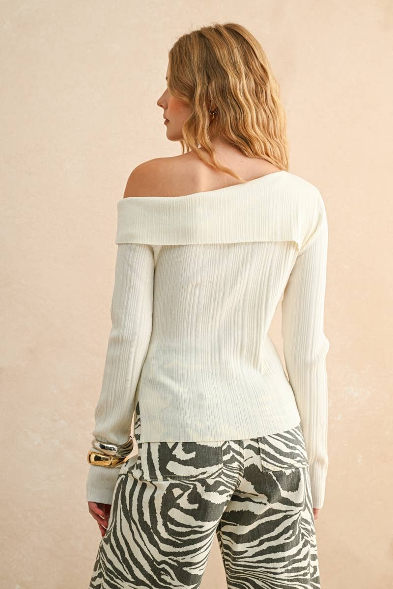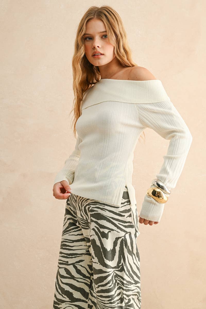 Ribbed off the shoulder long sleeve top. Model is wearing size small.