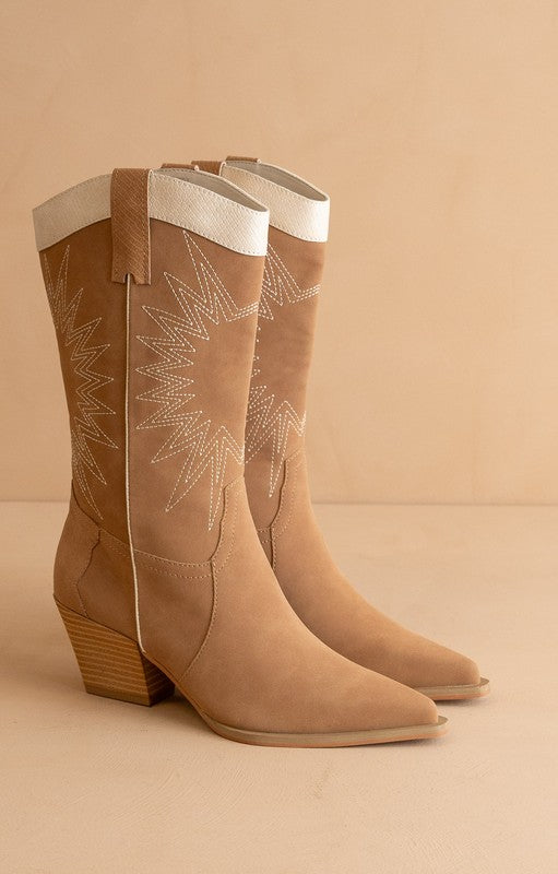 The Halle Camel | Paneled Cowboy Western Boot Snake Print