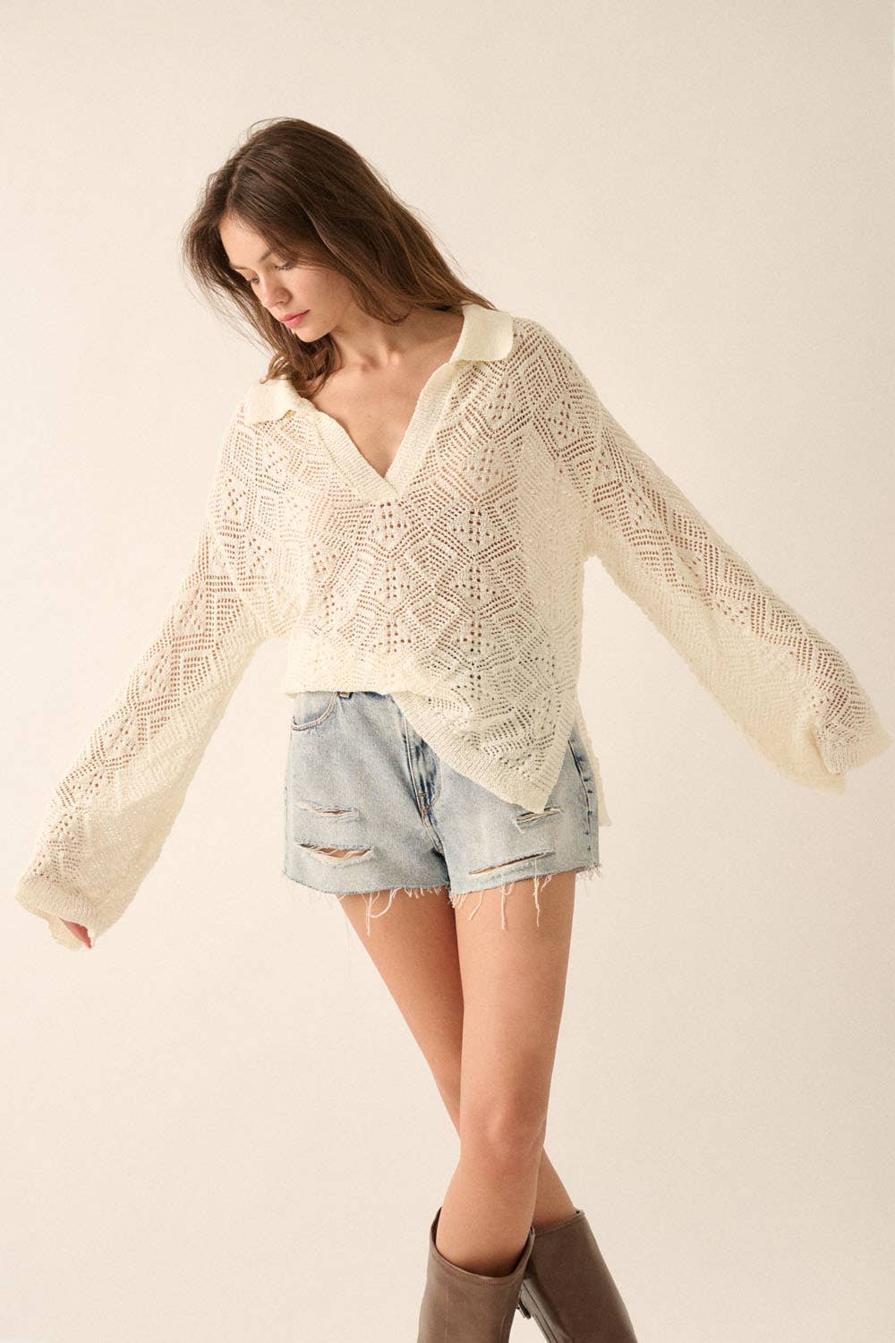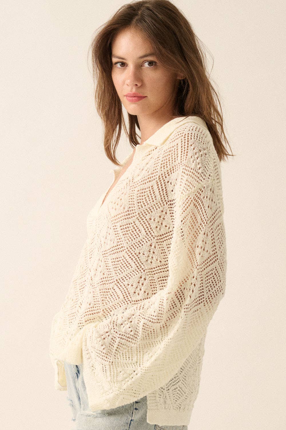 Geometric Crochet-Knit V-Neck Bell-Sleeve Sweater