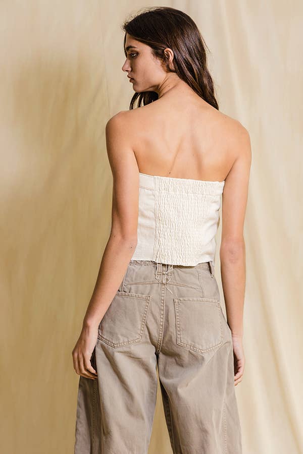 Crème Strapless Smocked Denim Corset Top - Cropped top with straight neckline - Patch pockets with flaps ant chest - Back Smocked detail - Front metal button closure