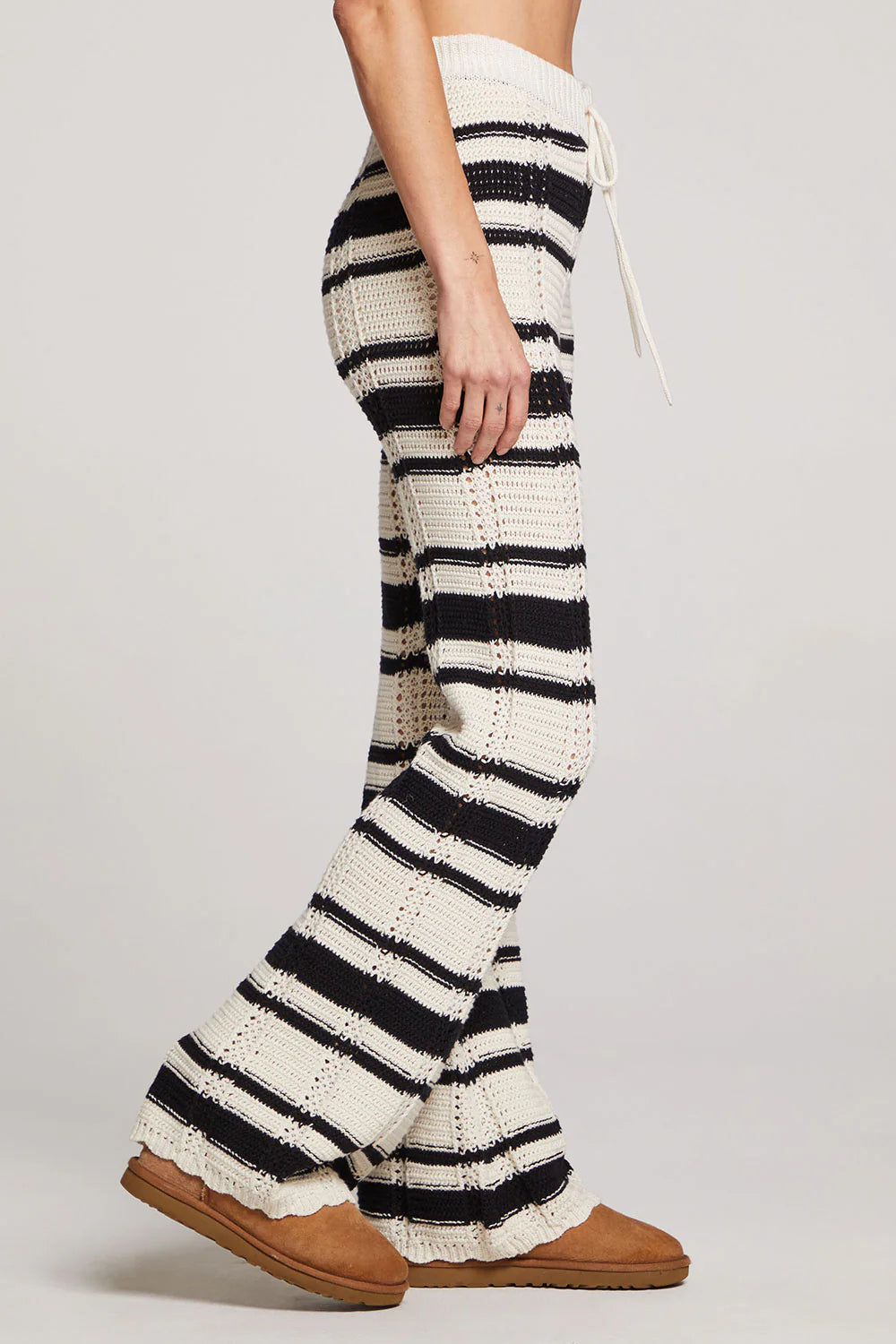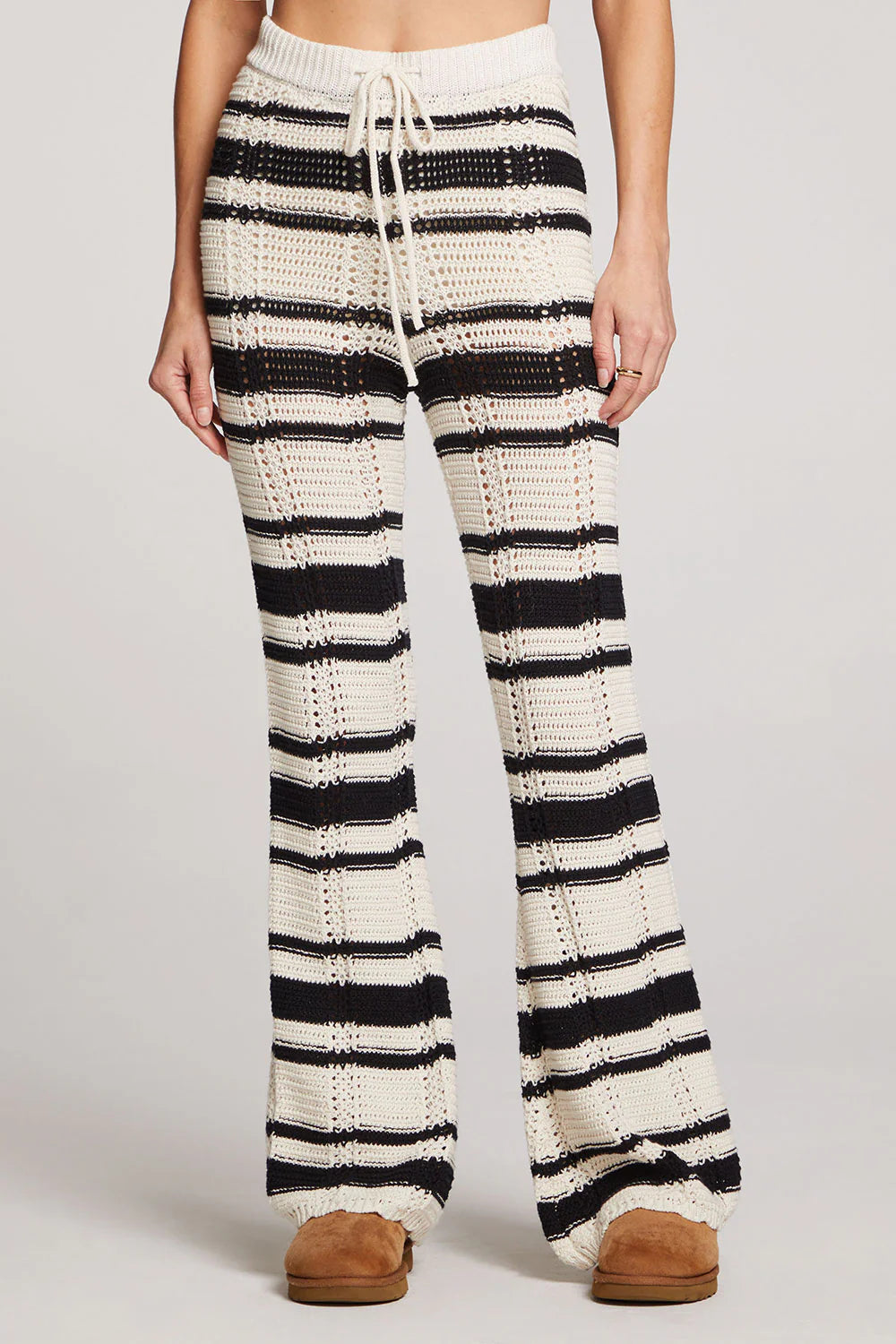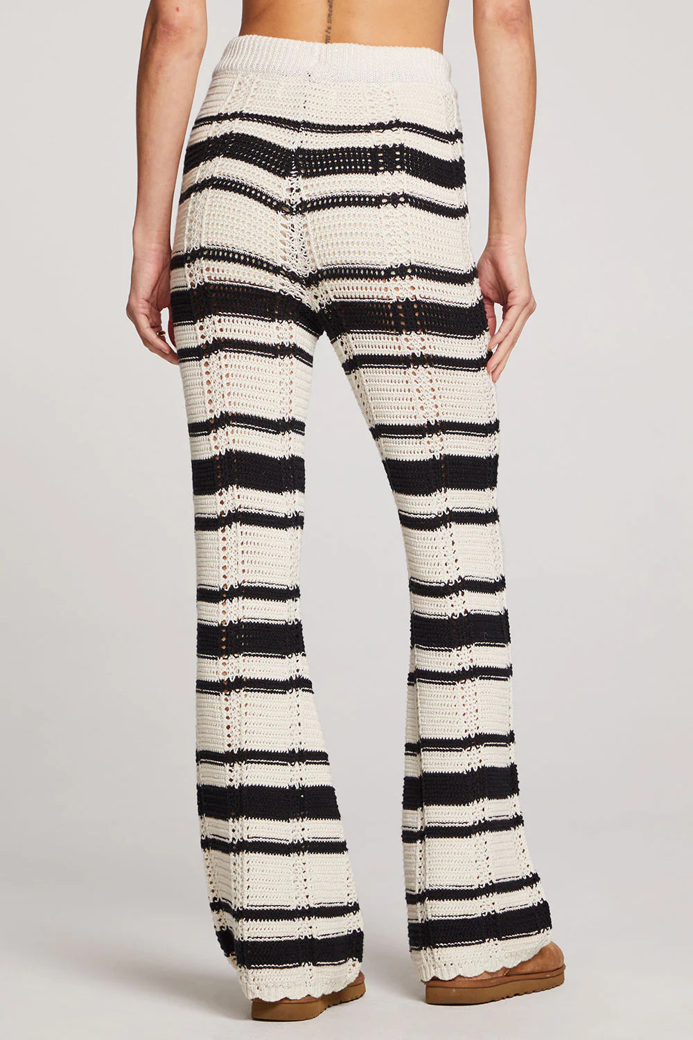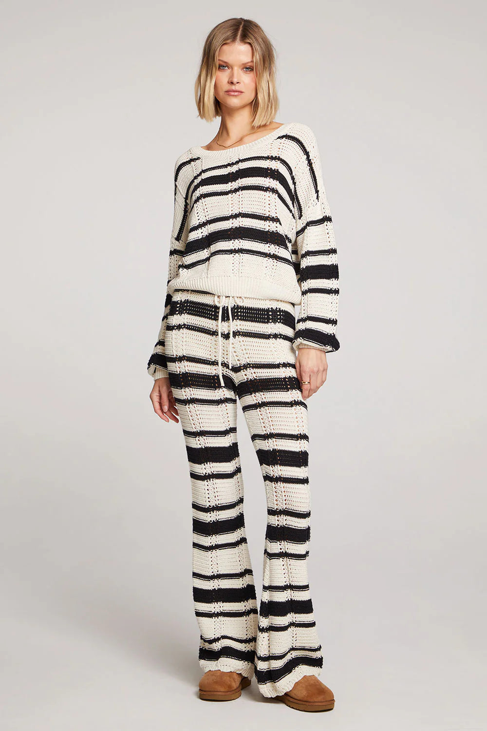 Bold black and white stripes and crochet look weaving make this cozy piece a true style statement.