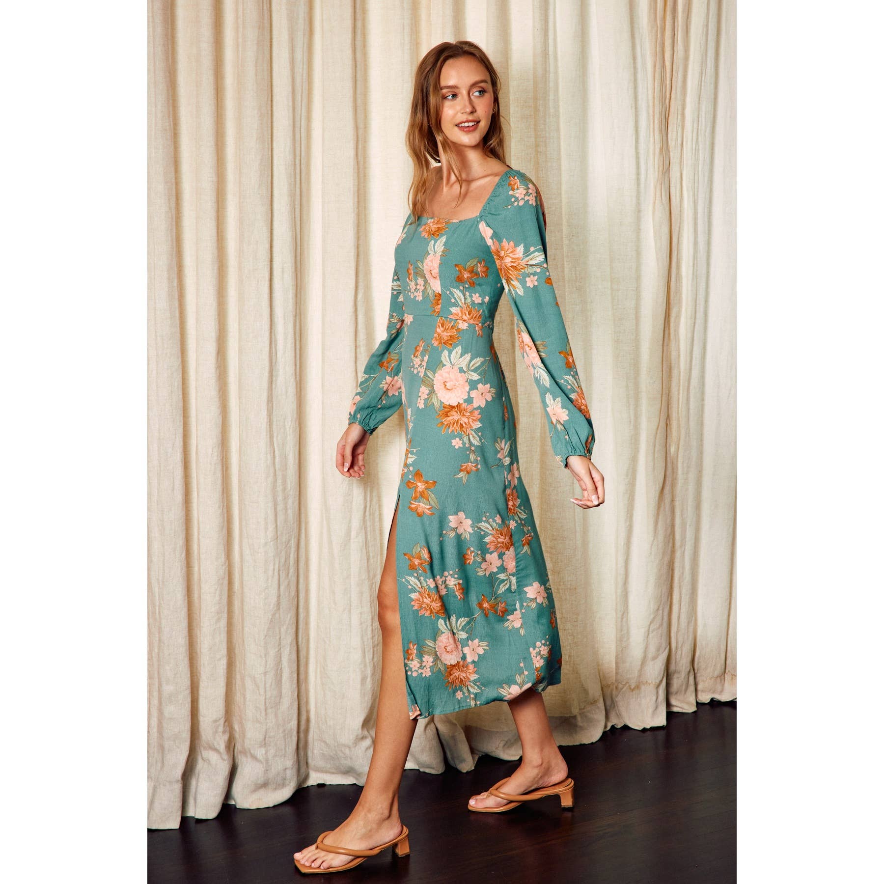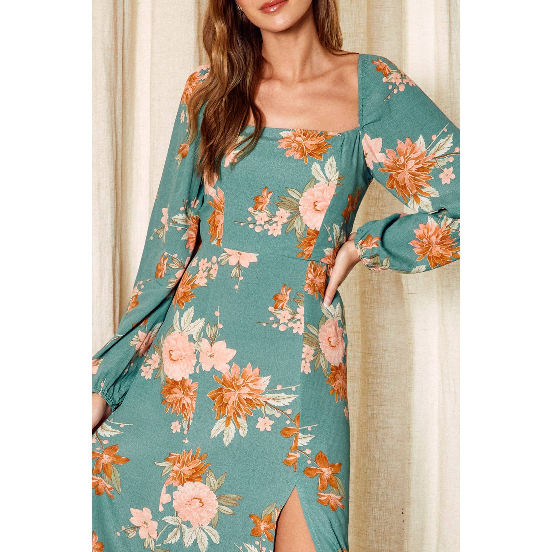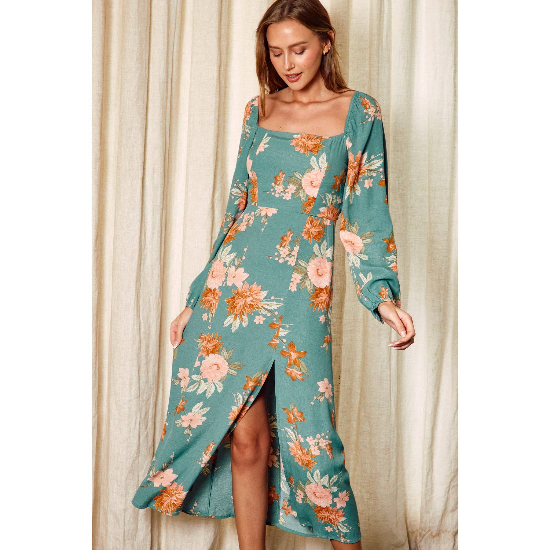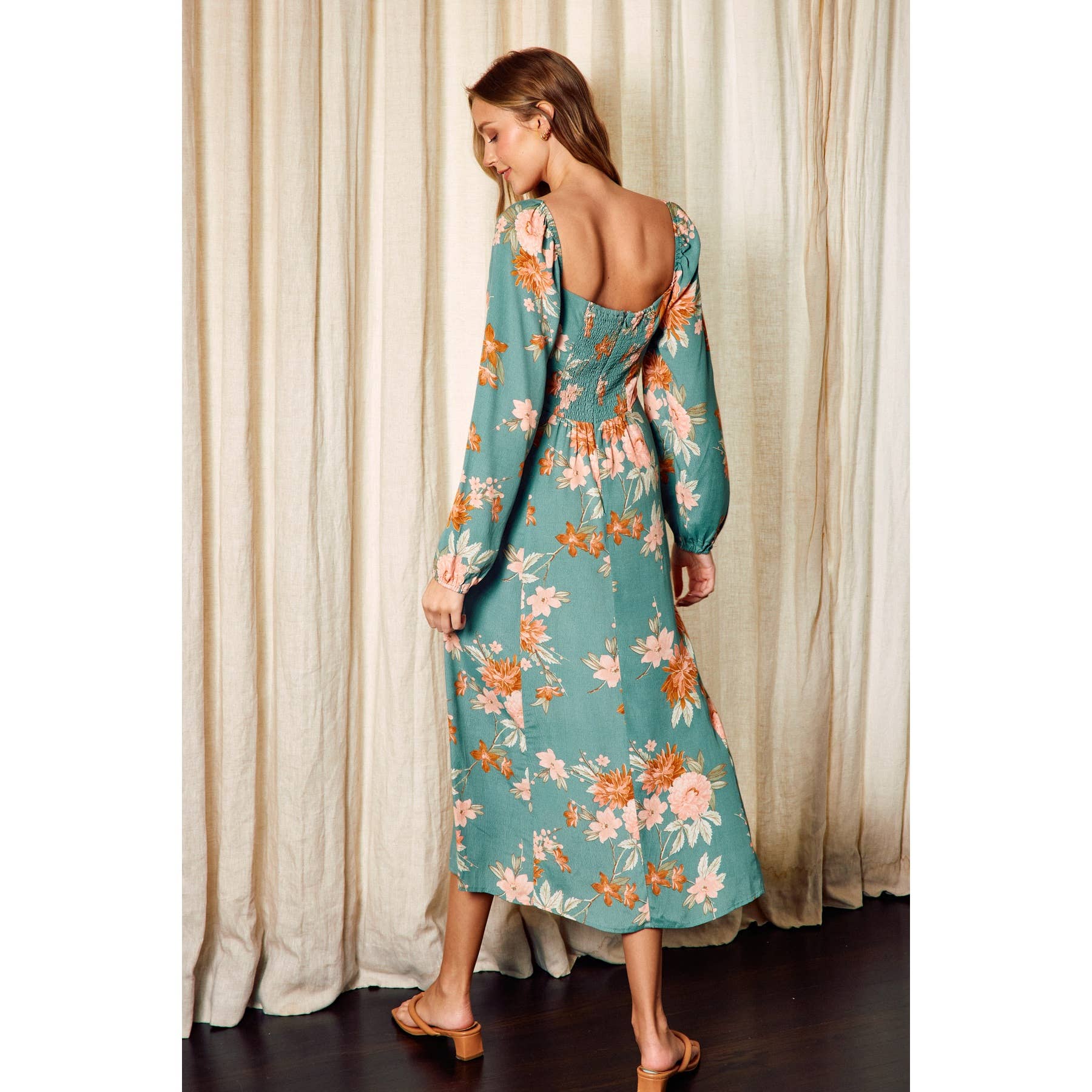 This floral print midi dress features an elasticated square neckline, ruching at bust, smocked back, and a side slit. Fully lined. Model is 5'10" and wearing size Small. Shell: 100% Rayon Viscose Lining: 100% Rayon