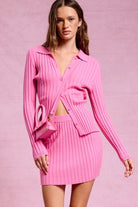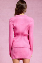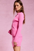 This ribbed knit set delivers a modern coquette vibe with effortless day-to-night wearability. The collared button-up cardigan pairs with a coordinating mini skirt featuring a comfortable elastic waistband, creating a flattering silhouette that holds its shape. Easy to style with loafers or tights for the office, then switch to boots or heels for after-dark plans, this two-piece set is a versatile fall favorite.