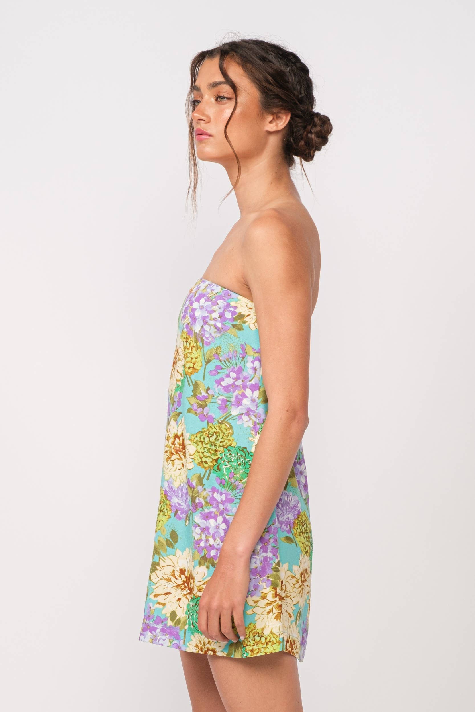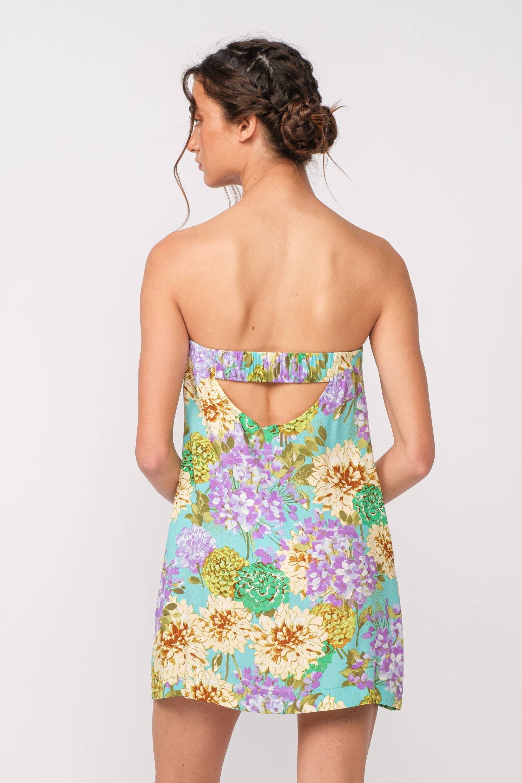 Floral Print Strapless Rubber Band on Back Plain Mini Dress 100%RAYON *