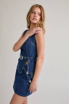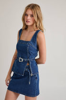 Belted Denim square neck top. Model is wearing a size small. Pair with the denim mini or rock it with a pair of jeans!
