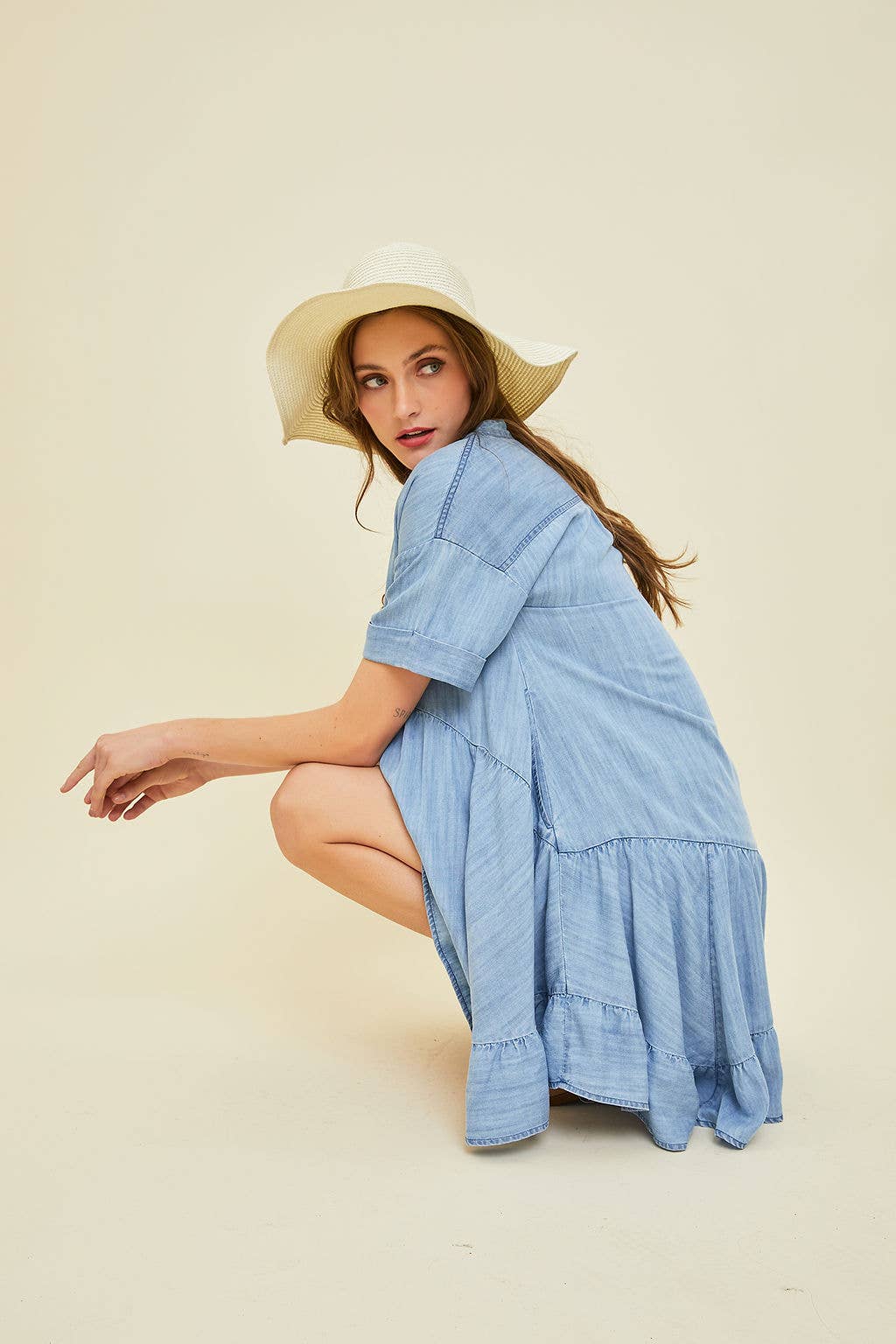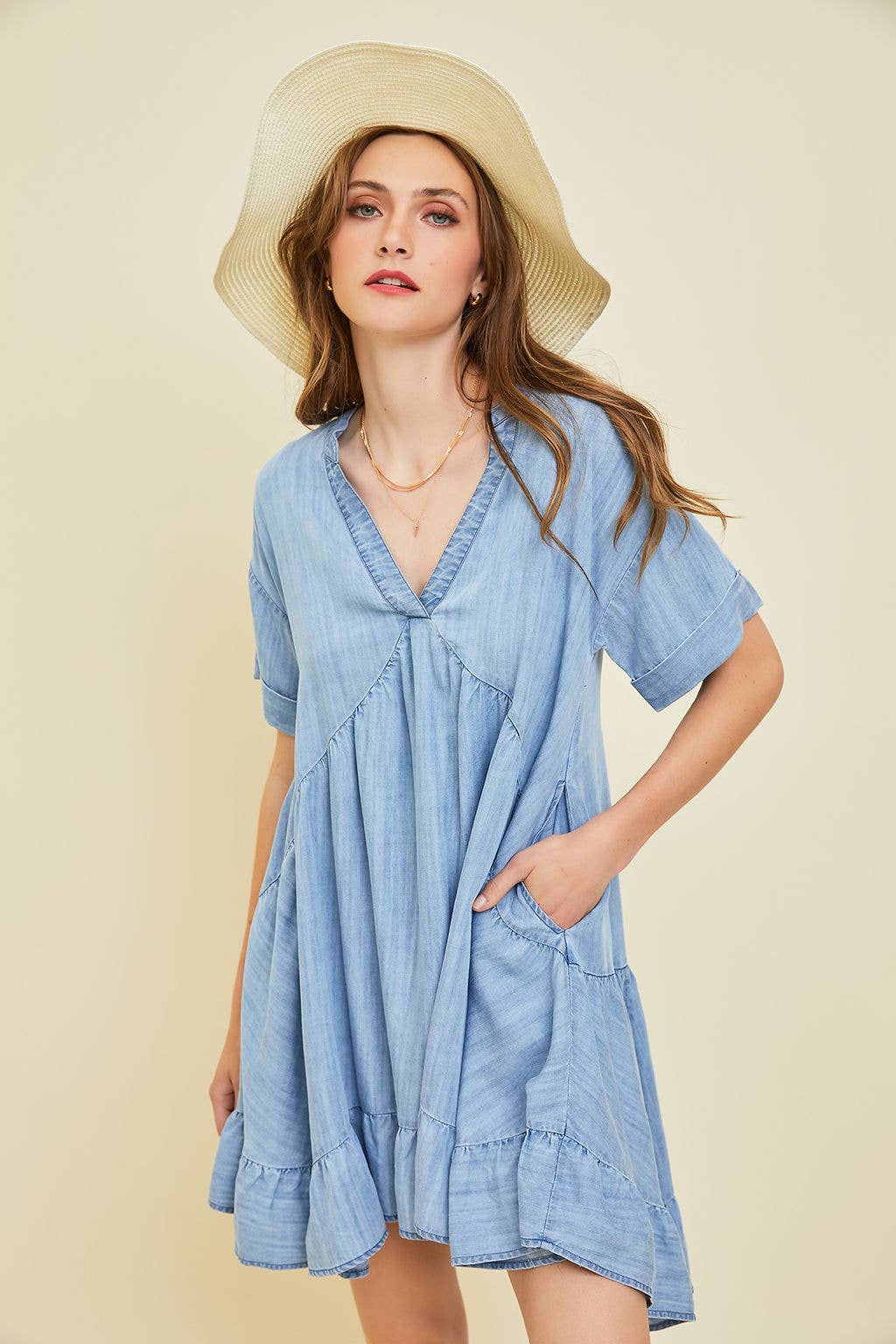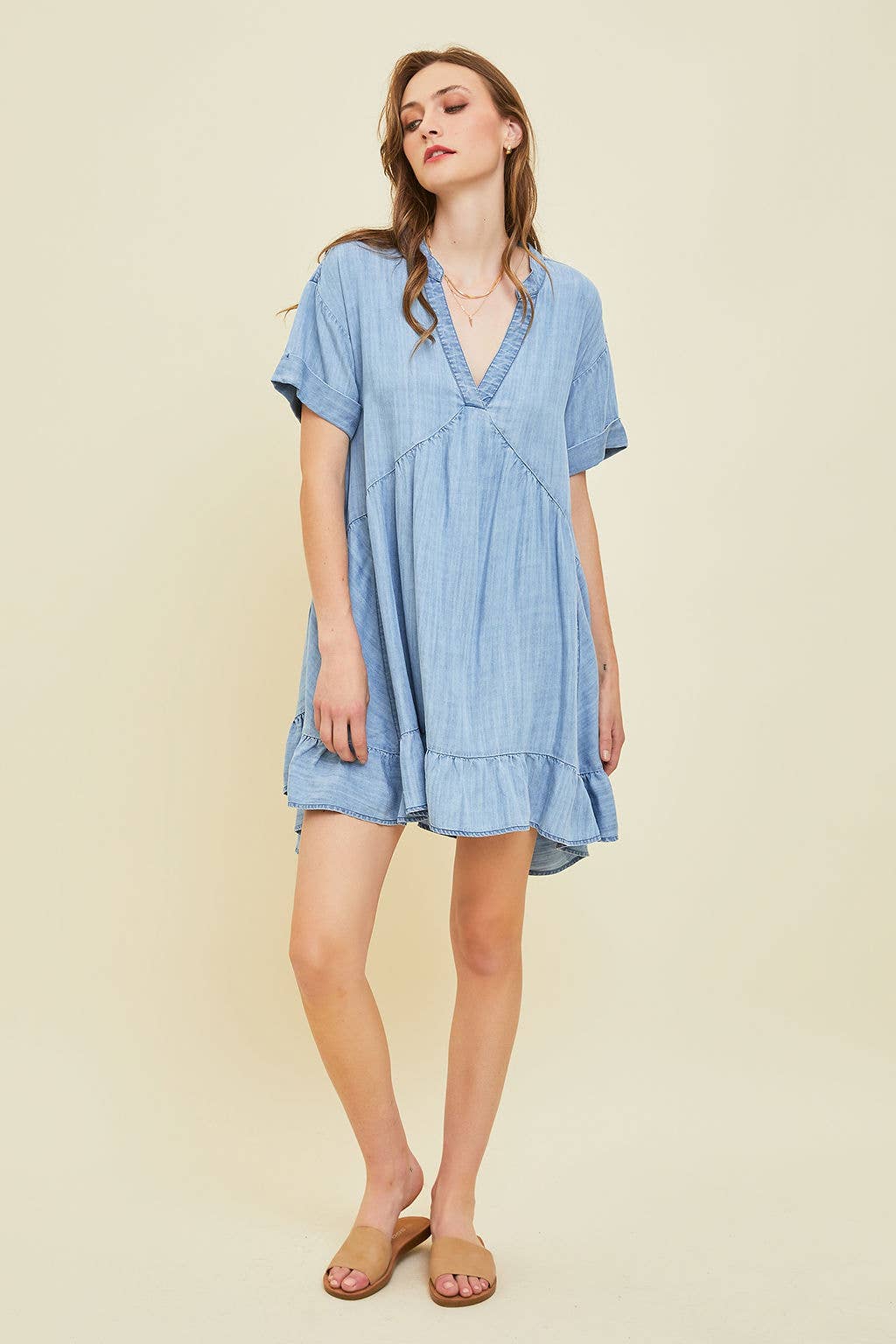 WASHED CHAMBRAY DENIM FLARE MINI DRESS