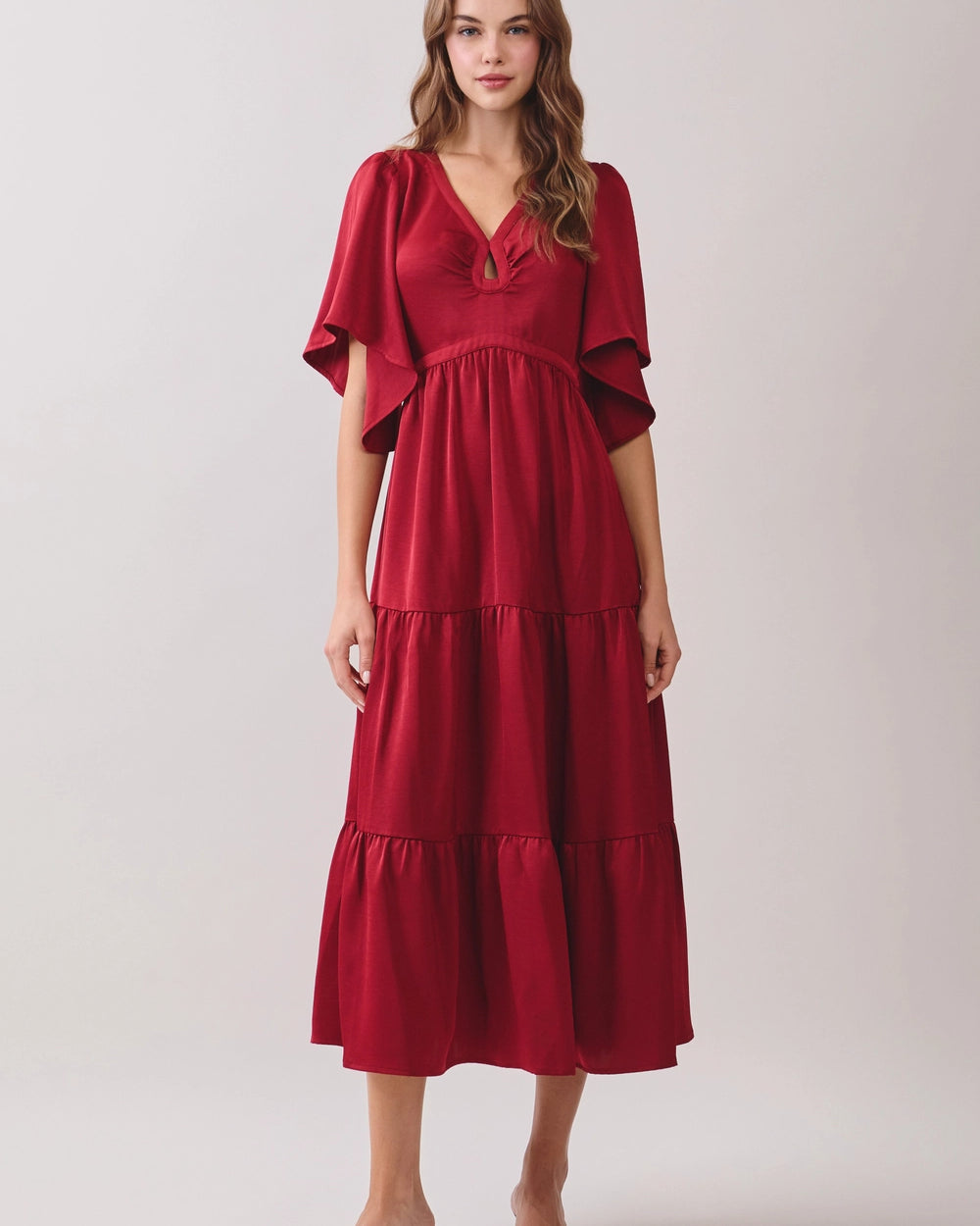 Embrace the full, flowing skirt that elegantly drapes from the gathered bodice.