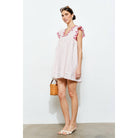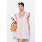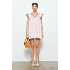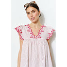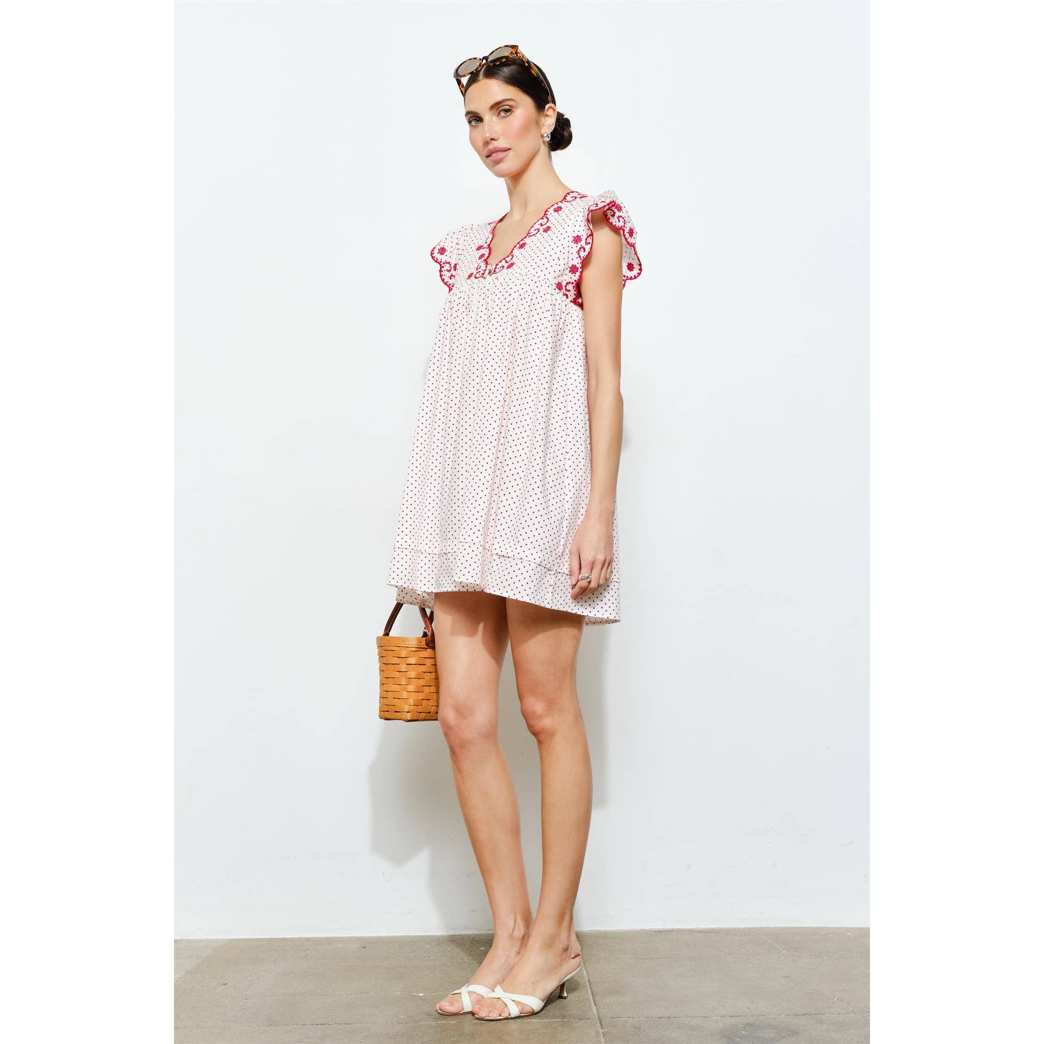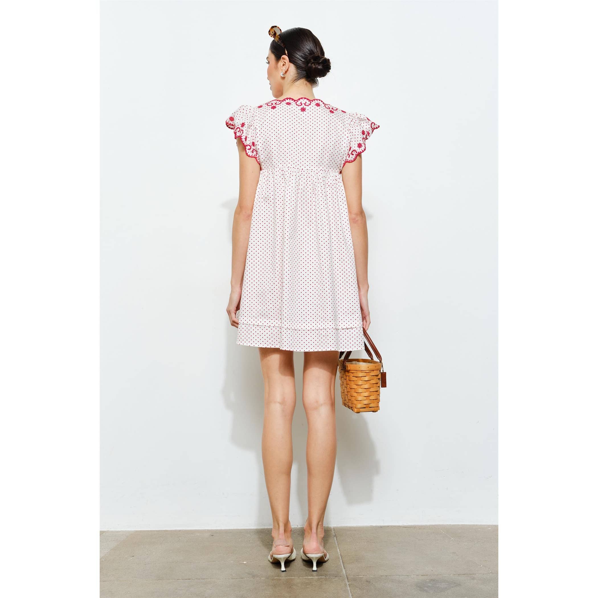 Crisp lightweight cotton with an all-over micro dot print reads effortlessly warm-weather. The empire-seamed babydoll silhouette swings free from the bust, skimming the body with ease through a mini-length hem. Red floral embroidery traces the scalloped neckline and flutter sleeves, delivering handcrafted charm that photographs beautifully. S: 100% Cotton