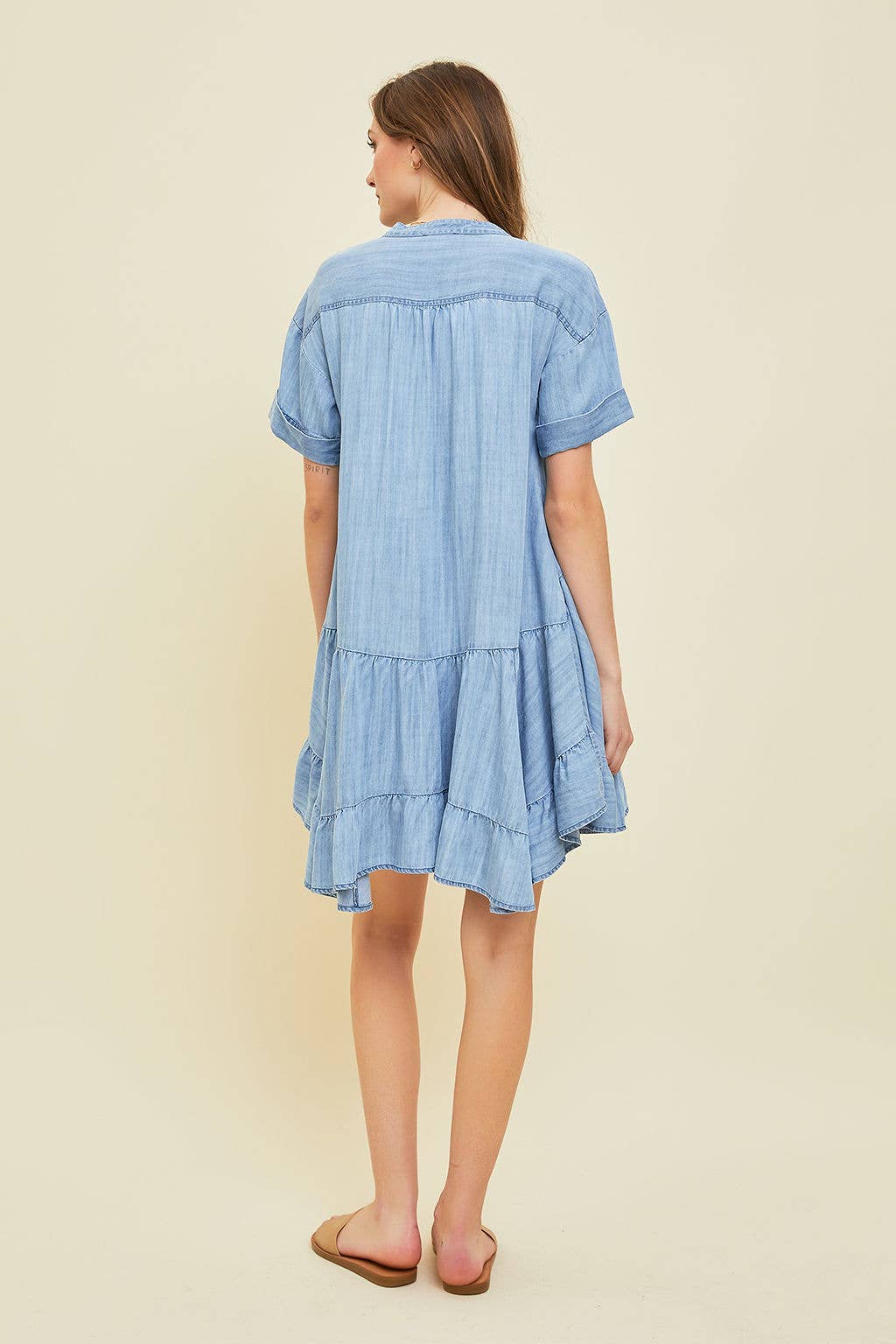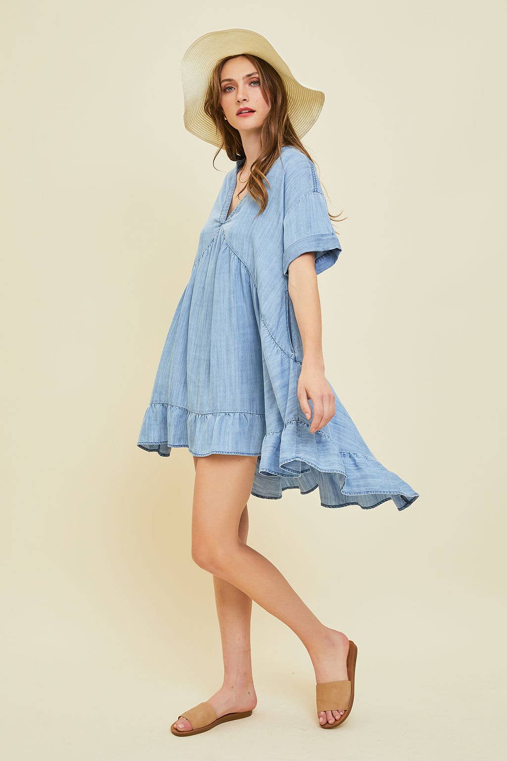 WASHED CHAMBRAY DENIM FLARE MINI DRESS