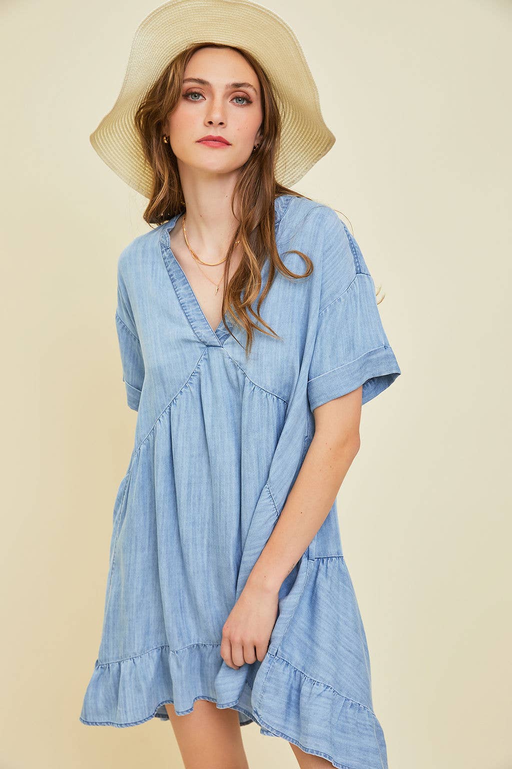 WASHED CHAMBRAY FLARE MINI DRESS MADE FOR EVERY DAY & FEATURED IN A SWINGY SILHOUETTE AND POCKETS