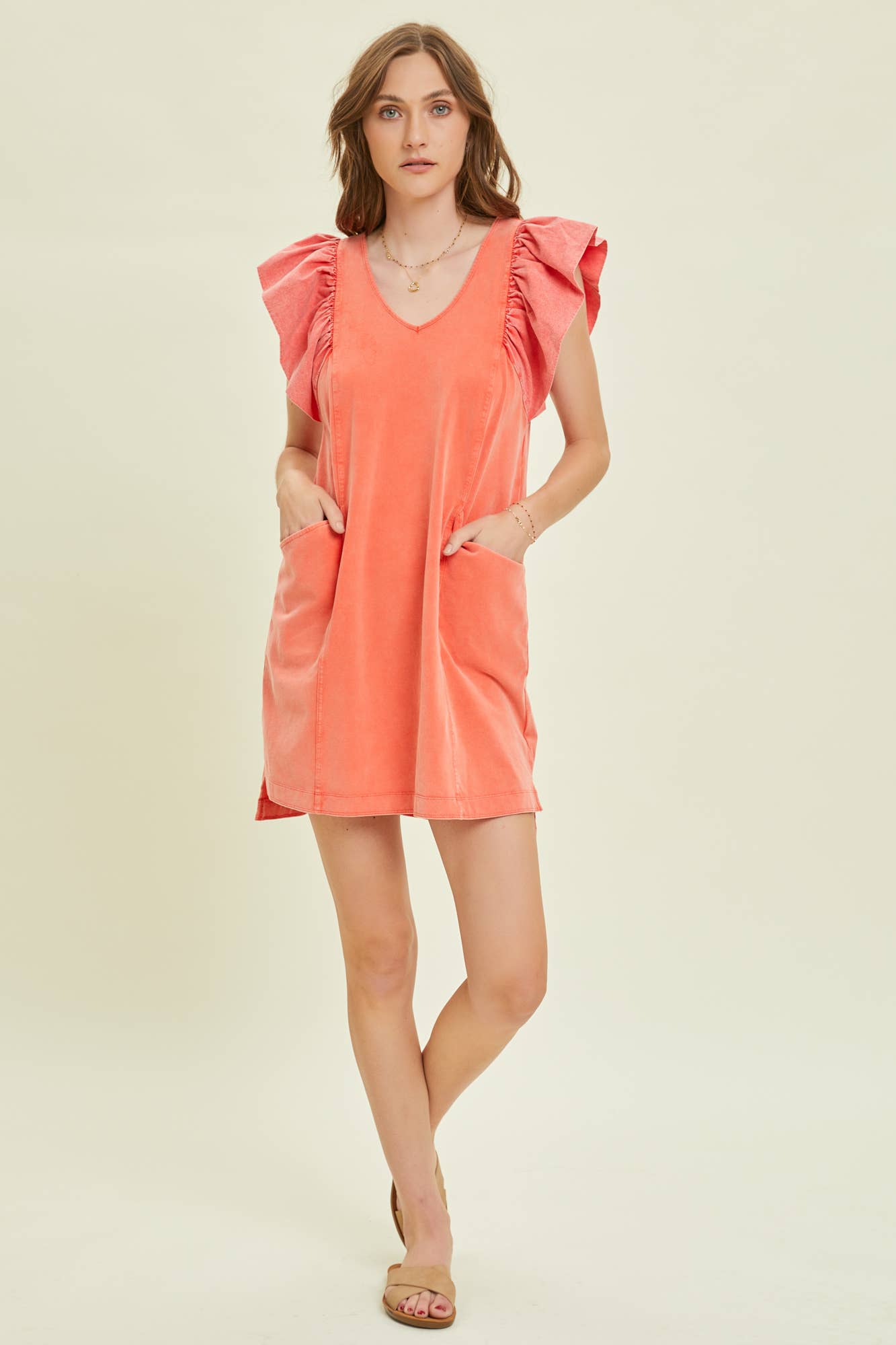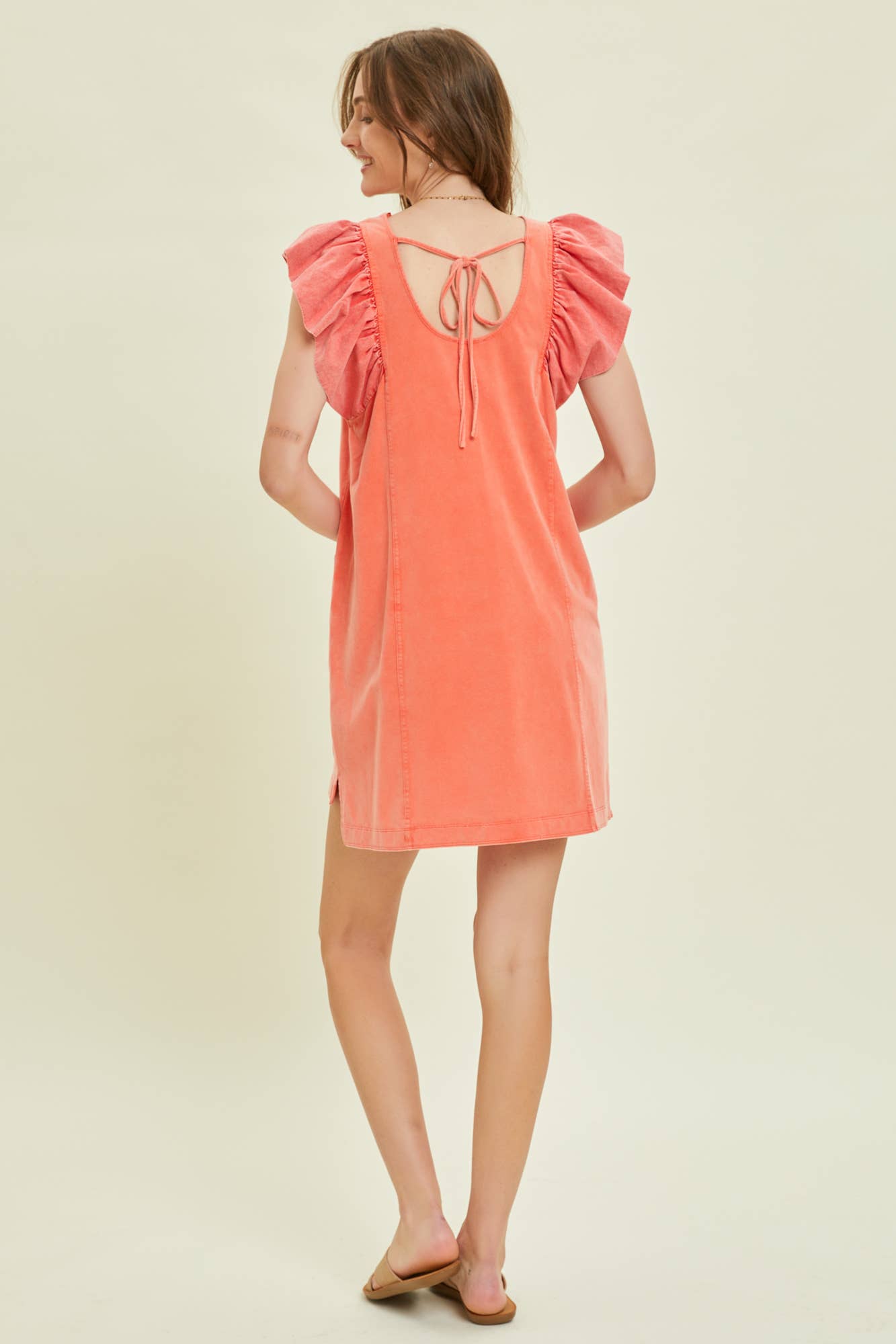 MINERAL-WASHED, FABRIC-MIXED MINI V-NECK DRESS WITH RUFFLED SLEEVES AND BACK TIE DETAIL The unique color of the pigment vintage wash is achieved through a special dye and washing process. Results vary from one another, creating a unique and natural variance in texture, distress, and shade.